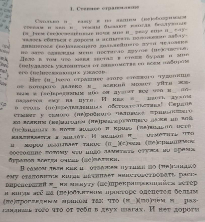 Сколько в езжу я по нашим (не)обозримым степям и как в темны бывают иногда безлунные ( )чем (не)освещённые ночи мне н разу еще я слу чалось сбиться с дороги и испытать положение заблу- дившегося (не)знающего дальнейшего пути человека но зато однажды меня постигло другое (не)счастье. Дело в том что меня застал в степи буран и мне (не)удалось уклониться от знакомства со всем набором его (не)иссякающих ужасов. от которого далеко H Нет (н )чего страшнее этого степного чудовища всякий может уйти жи- вым и (не)вредимым ибо он душит всё что н падается ему на пути. И как по- H пасть духом столь (не)предвиденных обстоятельствах! Сердце стынет у самого (не)робкого человека привыкшего ко всяким (не)взгодам (не)реагирующего даже на вой (не)видных в ночи волков и кровь (не)вольно оста- навливается в жилах. И нельзя н отметить что - н мороз вызывает такое (н_ )(с)чем (не)сравнимое состояние потому что надо заметить стужа во время буранов всегда очень (не)велика. - В самом деле как н_ отважен путник но (не)сладко ему становится когда начинает неистовствовать расс- вирепевший н на минуту (не)прекращающийся ветер и когда всё на (не)объятном просторе оденется белым (не)проглядным мраком так что (н_)(по)чём н раз- глядишь того что от тебя в двух шагах. И нет дороги me np . Назови рас(?)но места! 0. 6. 3 порубле ему и ср ясните nos. OXE