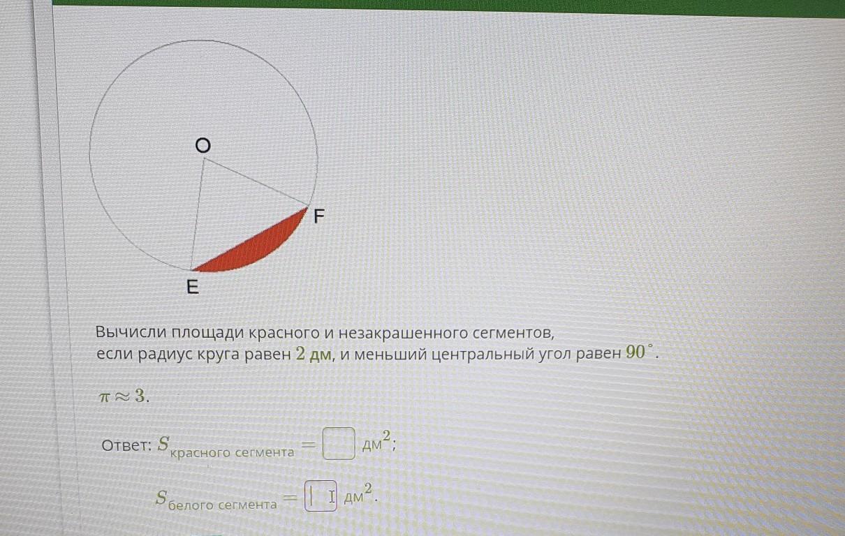 Меньший центральный угол ∠EOF = 90°; Ну значит сектор, ограниченный радиусами EO и OF и меньшей дугой EF - это 1/4 полного круга, а площадь полного круга π2² = 4π. То есть площадь этого сектора равна π. А площадь △EOF = EO*OF/2 = 2; => площадь красного сегмента π-2; а белого 4π - (π-2) = 3π+2; если считать π=3, то ответы 1 и 11, а в сумме - площадь всего круга 12.