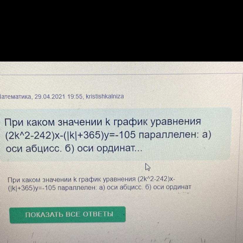 б) Чтобы параллельно ординате, нам нудно скобка перед y равна 0. Тогда |k|+365=0. Тогда получается, что |k|=-365. А этого не может быть, так как модуль k может быть только положительным. Поэтому ни при каких.