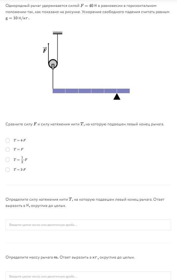 Рычаг имеет длину 6. Точка опоры расположена на 5 от силы натяжения нити и 2 от центра тяжести рычага.