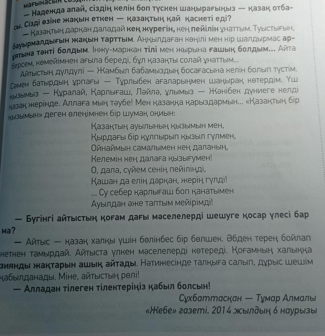 Я подошла к порогу нашего предка Жамбыла как невеста. Познакомился с братьями Турлыбеками, потомками Самен Батыра. Три наши дочери Куралай, Карлыгаш, Лейла и наш сын Жанибек родились на казачьей земле. Тысяча покаяний Аллаху! Я в долгу перед казаками... Читаю строчку из стихотворения "Я казашка":
