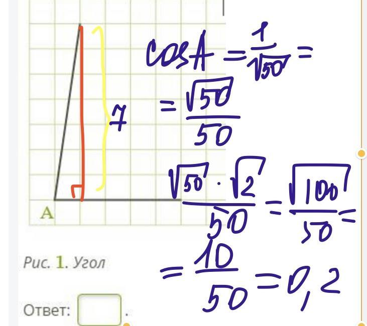 Гипотенуза тогда корень из 50. По тригонометрическим соотношениям косинус 1/ корень из 50 = корень из 50/ 50