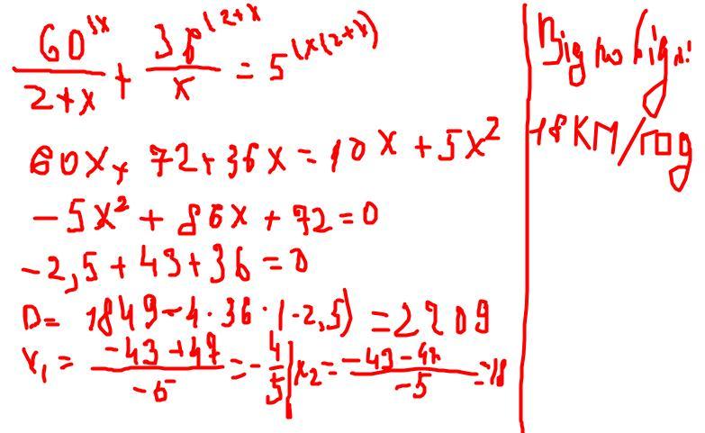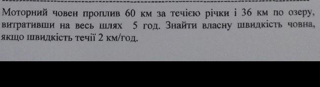 Нехай швидкість човна - x км/год. За умовою задачі він проплив 60 км за течією річки (швидкість течії 2 км/год) і 36 по озеру, витративши на весь шлях 5 год. Складемо рівняння: