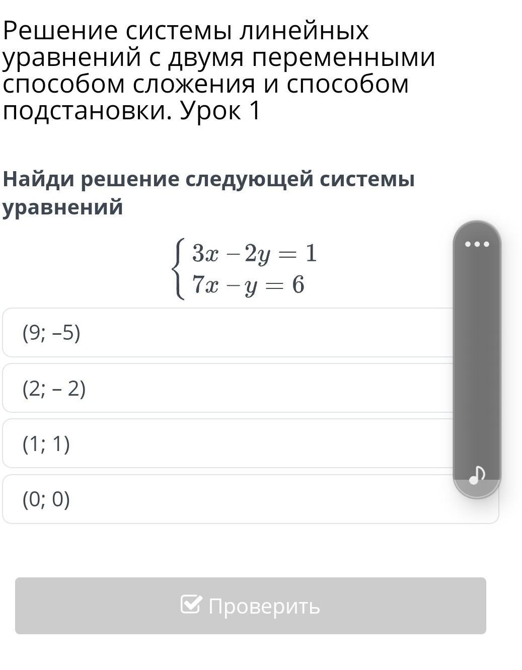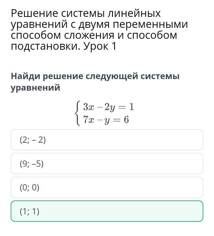Урок 1 Найди решение следующей системы уравнений (9; –5) (2; – 2) (1; 1) (0; 0) Назад Проверить