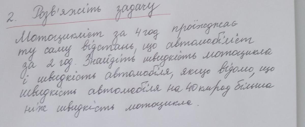 х + 40 км/год , автомобіль за 4 години проїхав 4х км, а мотоцикл за 2 години проїхав 2(х + 40) км. Складемо рівняння:
