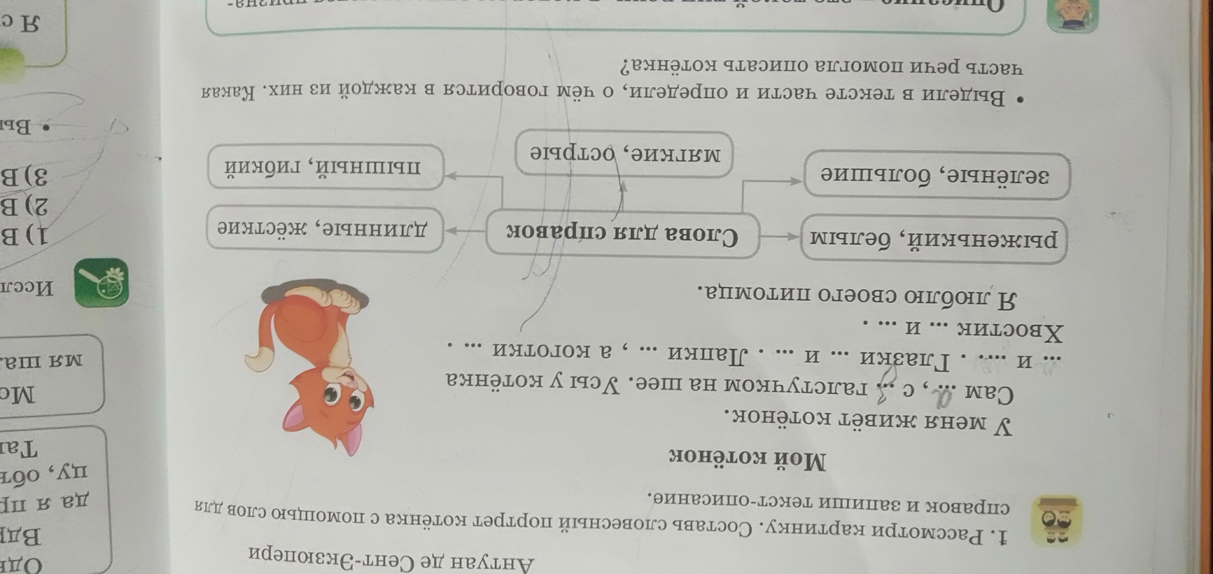 Сам рыженький, с белым галстучком на шее. Усы у котенка длинные и жесткие. Глазки зеленые и большие. Лапки мягкие, а коготки острые. Хвостик пышный и гибкий.