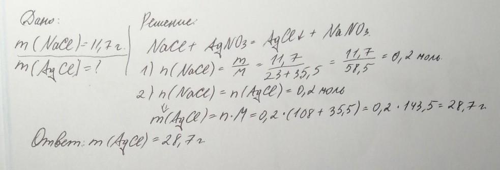 Натрій хлорид масою 11,7 г взаємодіє з аргентум (І) нітратом. Обчисліть масу утвореного осаду. РОЗВ'ЯЗОК ЗАДАЧІ ПОВНИЙ.