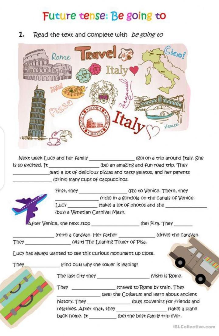 1. going to go, 2. going to be, 3. going to eat, 4. going to drink, 5. going to fly, 6. going to read, 7. going to take, 8. going to be, 9. going to rent, 10. going to drive, 11. going to visit, 12. going to find out, 13. going to visit, 14. going to travel, 15. going to see, 16. going to buy, 17. going to take, 18. going to be.