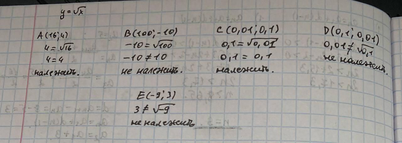 Не будуючи графіка функції у = √х, встановіть, чи нале- жать йому точки: А(16;4); В(100; -10); C(0,01; 0,1); D(0,1; 001); E(-9; 3)?