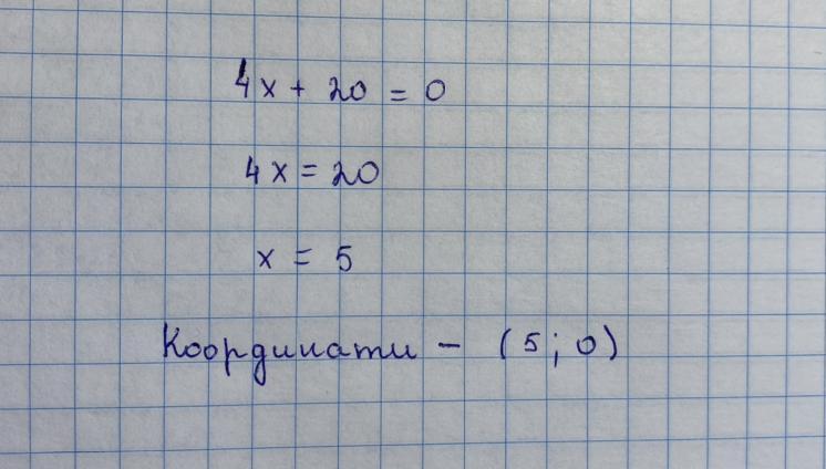 Не виконуючи побудови графіка, знайти точку перетину графіка функції у = 4х + 20 з віссю абсцис. (координати записуйте в дужках , відділяючи їх крапкою з комою)