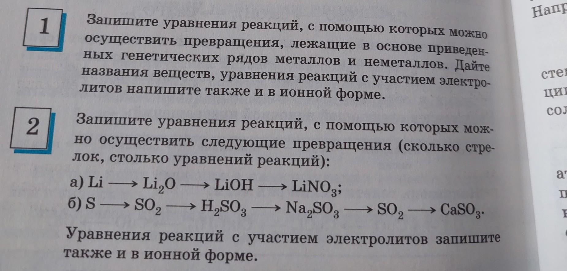 1 Запишите уравнения реакций, с помощью которых можно осуществить превращения, лежащие в основе приведен- ных генетических рядов металлов и неметаллов. Дайте названия веществ, уравнения реакций с участием электролитов напишите также и в ионной форме.