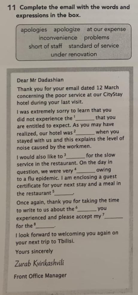 1 the standard of service 2 under renovation 3 apologize 4 short of staff 5 at our expense 6 problems 7 apologies 8 inconvenience