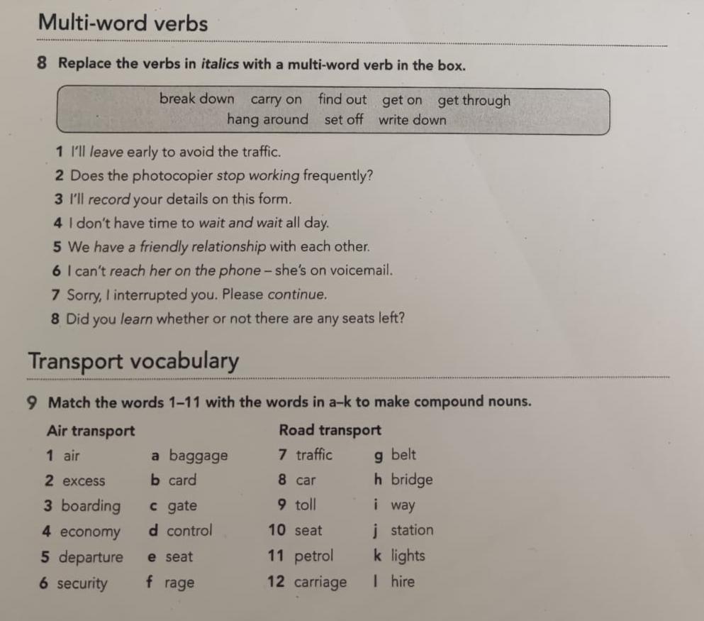 1 set off 2 break down 3 write down 4 hang around 5 get on 6 get through 7 carry on 8 find out