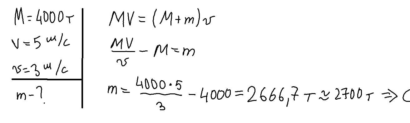 криголам маса якого 4000 т рухається рівномірно 5 м/с, навтошнувшись на рижану, він руха її по переду себе зі швидкістю 3м/с Знайти масу крижини. А:10700т, B:3000т, C:2700т