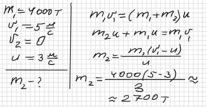 криголам маса якого 4000 т рухається рівномірно 5 м/с, навтошнувшись на рижану, він руха її по переду себе зі швидкістю 3м/с Знайти масу крижини. А:10700т, B:3000т, C:2700т. Кр срочно надо
