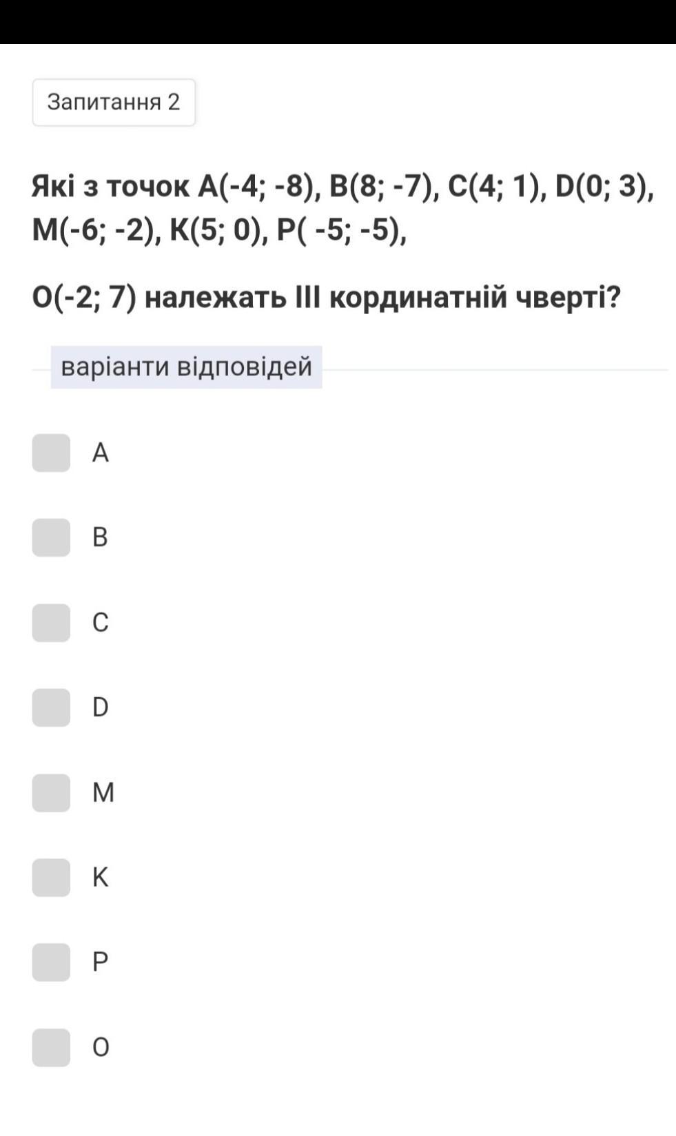 Запитання 2 Які з точок А(-4; -8), B(8; -7), C(4; 1), D(0; 3), M(-6; -2), K(5; 0), P( -5; -5), 0(-2; 7) належать III кординатній чверті?
