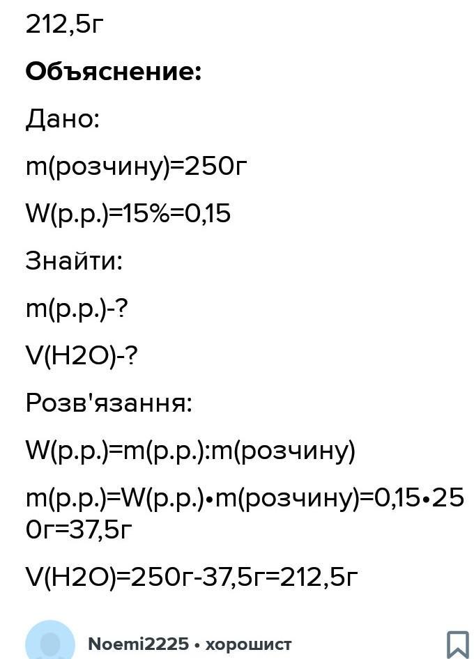 Обчисліть масу води, що міститься в розчині масою 250 г із масовою часткою розчиненої речовини 15 %.