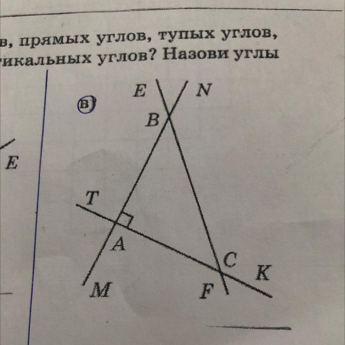 Вертикальные (это углы которые лежат напротив друг друга и они равны): ABC = EBN, BCA = KCF, TAB = CAM, TAM = BAC, NBС = EBT, BCK = ACF. Итого 6 пар.