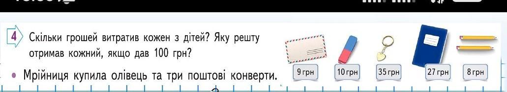 Скільки грошей витратив кожен з дітей? Яку решту отримав кожний, якщо дав 100 грн? ● Мрійниця купила олівець та три поштові конверти. 9 грн 10 грн 35 грн 27 грн 8 грн