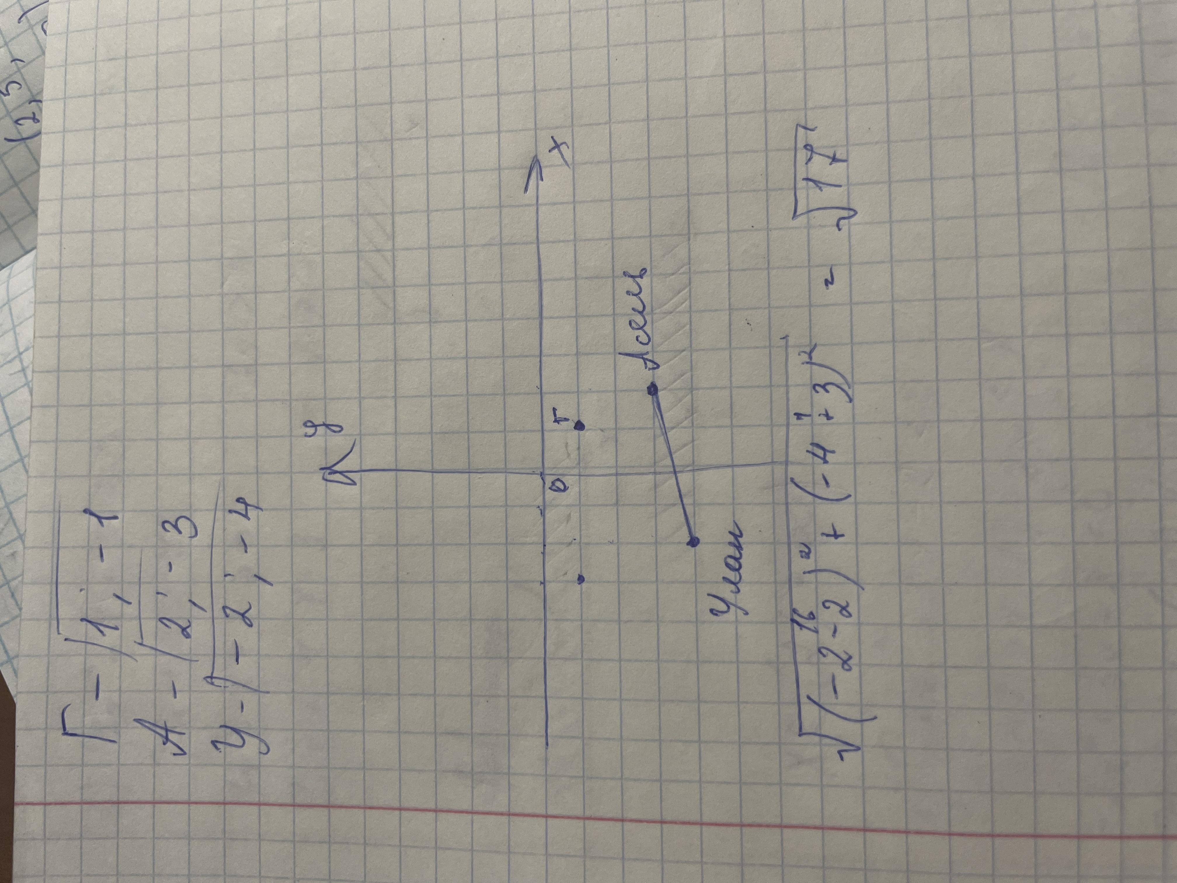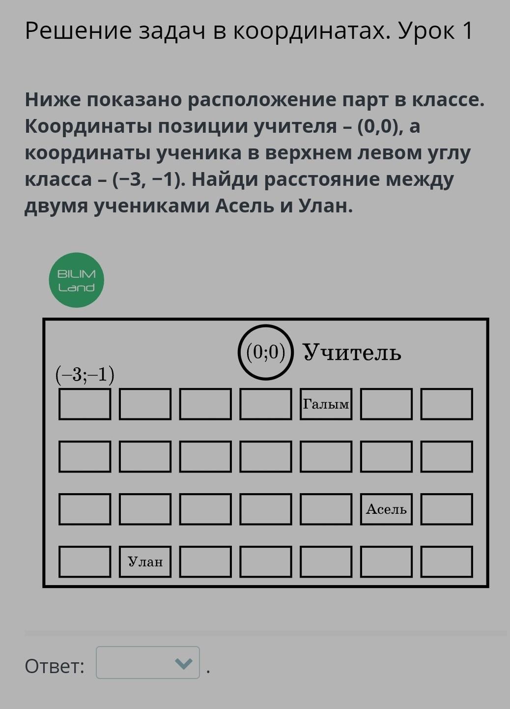 Ниже показано расположение парт в классе. Координаты позиции учителя – (0,0), а координаты ученика в верхнем левом углу класса – (−3, −1). Найди расстояние между двумя учениками Асель и Улан.
