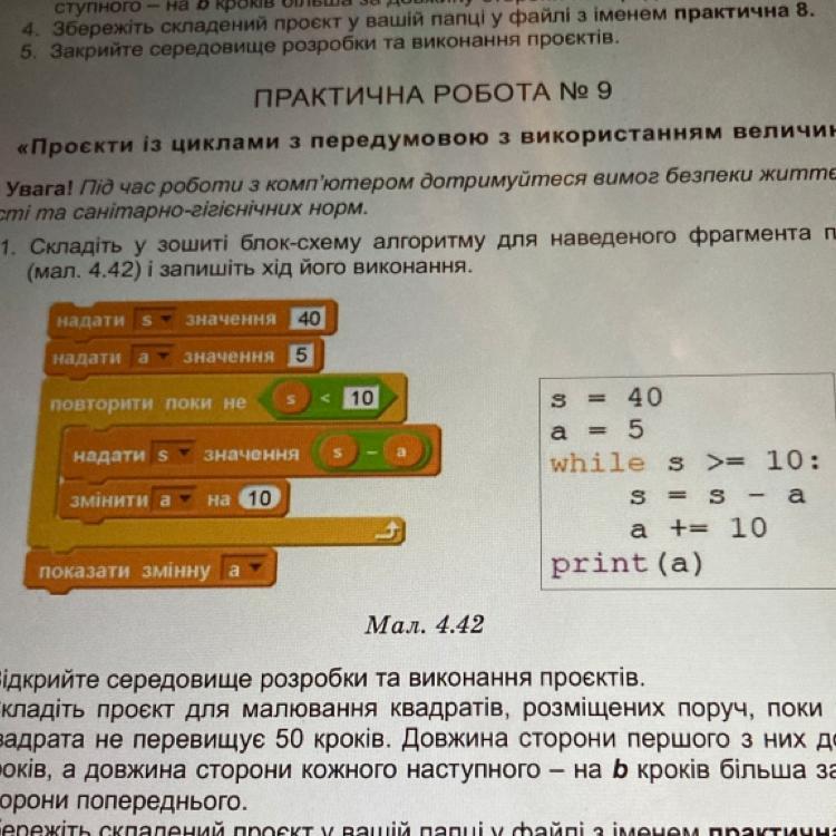 Складіть у зошиті блок-схему алгоритму для наведеного фрагмента проєкт (мал.4.42) і запишіть хід його виконання