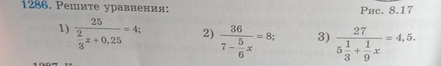 1286 . 1) 25/( 2/3 x + 0,25 ) = 4 ; 2 ) 36/( 7 - 5/6 x ) = 8 ;