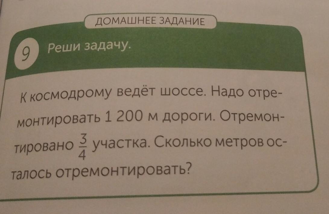 ДОМАШНЕЕ ЗАДАНИЕ Реши задачу. 9 К космодрому ведёт шоссе. Надо отре- монтировать 1 200 м дороги. Отремон- ЗА участка. Сколько метров осталось отремонтировать?