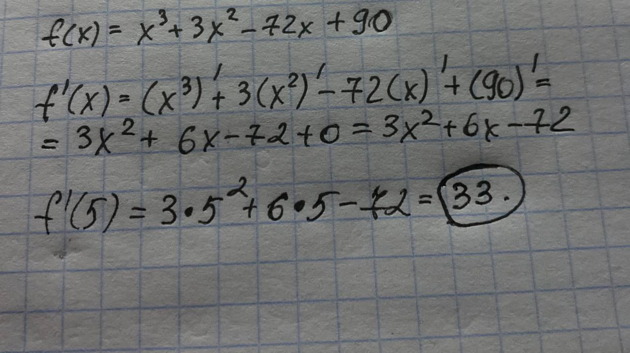 f ` (5) = 3 × 5^2 + 6 × 5 - 72 = 75 + 30 - 72 = 33