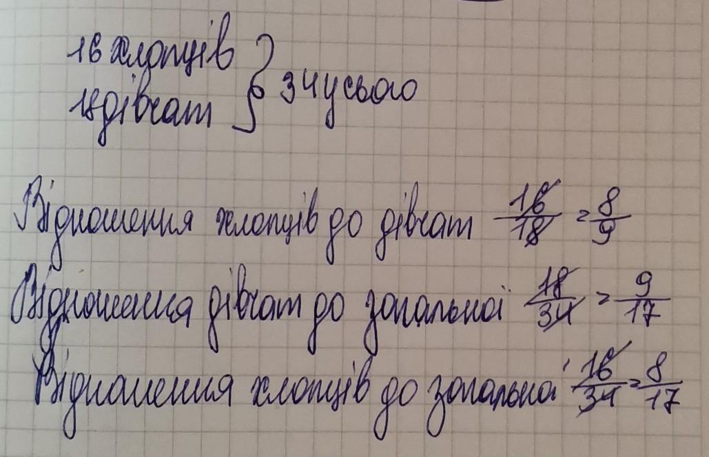 в одному класі навчається 16 хлопців і 18 дівчат знайдіть відношення кількості хлопців до кількості дівчат кількості дівчат до загальної кількості учнів кількості хлопців до загальної кількості учнів відповідь подайте в скороченій формі