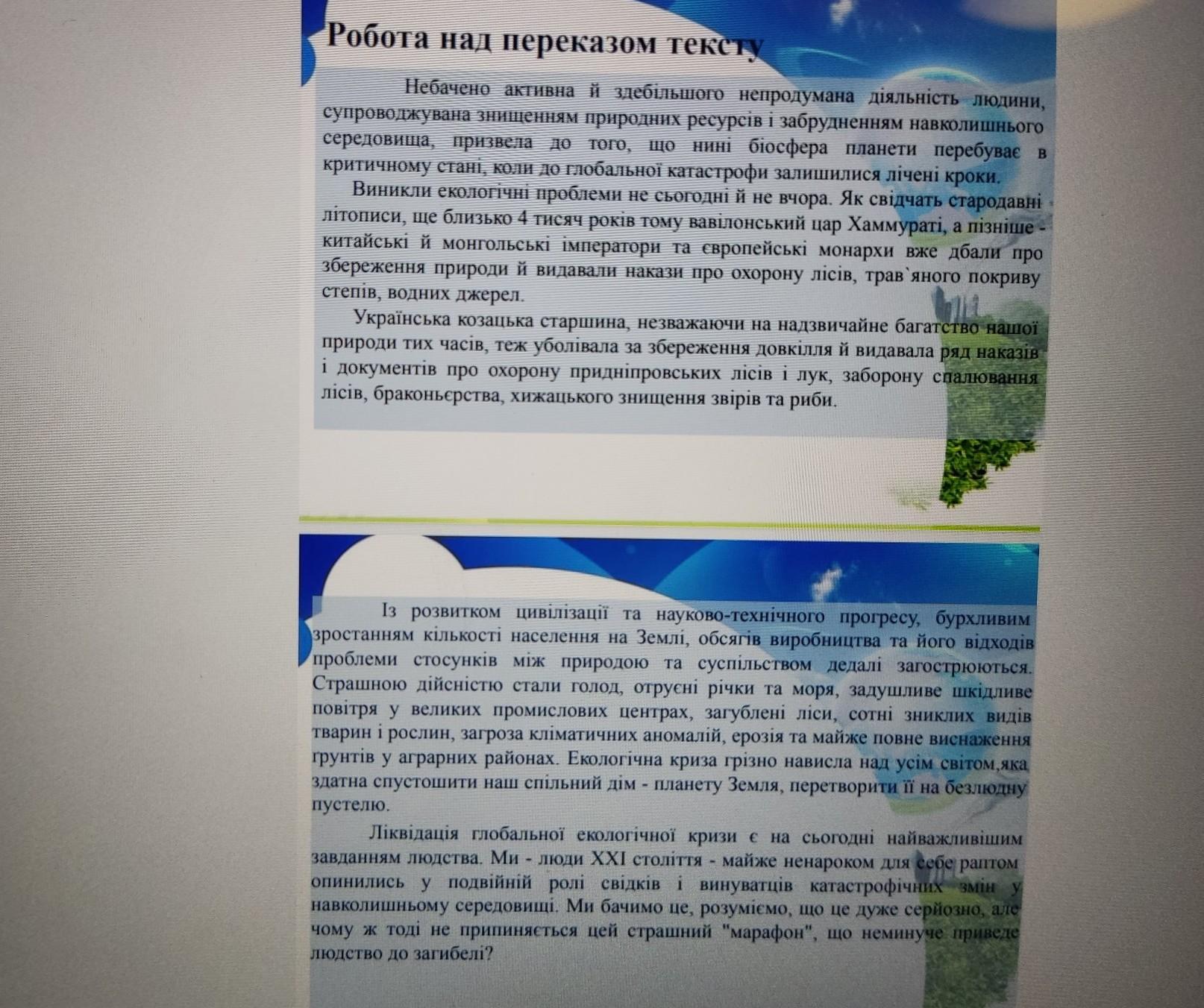 Упродовж тривалого часу Земля сама була здатна очищатися від різних видів забруднення. Але нині природні комплекси материків і океанів уже не встигають переробляти величезну кількість відходів і небезпечних речовин. Тому люди мають нарешті усвідомити, що збереження життя на планеті залежить від того, як вони дбають про довкілля