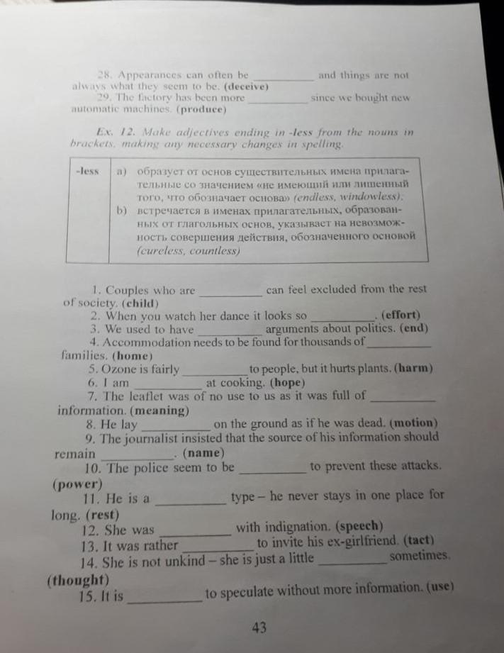 1. childless 2.effortless 3.endless 4.homeless 5.harmless 6. hopeless 7.meaningless 8.motionless 9.nameless 10.powerless 11.restless 12.speechless 13.tactless 14. thoughtless 15.useless