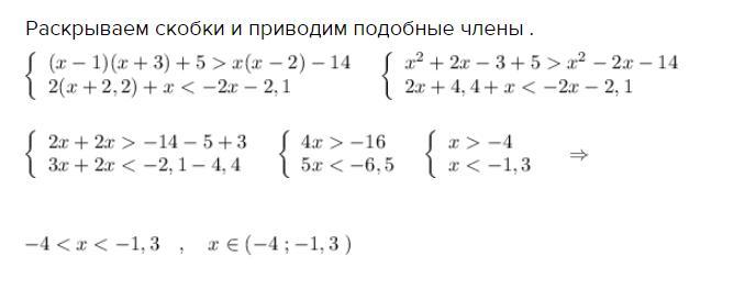 \begin{gathered}\left\{\begin{array}{l}(x-1)(x+3)+5 > x(x-2)-14\\2(x+2,2)+x < -2x-2,1\end{array}\right\ \ \left\{\begin{array}{l}x^2+2x-3+5 > x^2-2x-14\\2x+4,4+x < -2x-2,1\end{array}\right\\\\\\\left\{\begin{array}{l}2x+2x > -14-5+3\\3x+2x < -2,1-4,4\end{array}\right\ \ \left\{\begin{array}{l}4x > -16\\5x < -6,5\end{array}\right\ \ \left\{\begin{array}{l}x > -4\\x < -1,3\end{array}\right\ \ \ \Rightarrow\end{gathered}