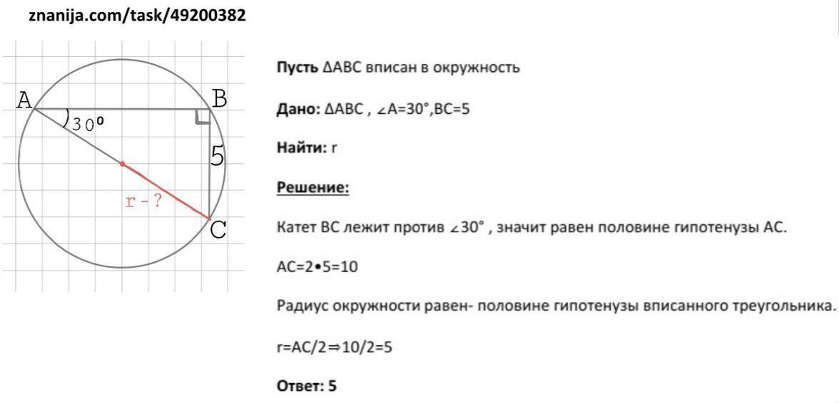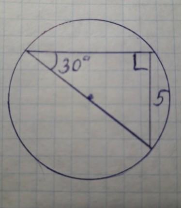 На рисунке прямоугольный треугольник. В прямоугольном треугольнике катет, лежащий против угла 30° = 1/2 гиротенузы. Гипотенуза- диаметр треугольника, значит равен 5×2, а радиус равен диаметр ÷ 2 =5×2÷2=5