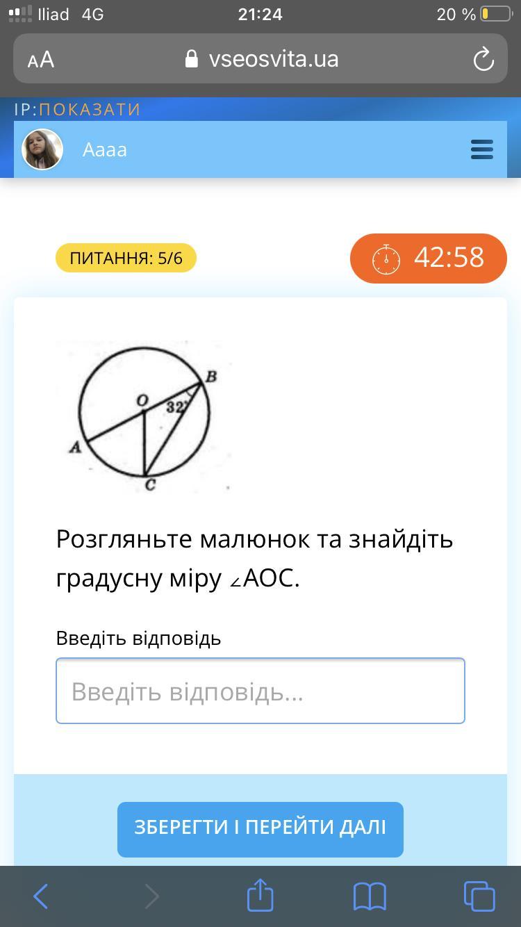 Вписаний кут дорівнює половині дуги, на яку спирається, а отже, ∡АВС = (1/2) від дуги АС. Тоді дуга АС становить 32° × 2 = 64°. Оскільки центральний кут дорівнює дузі, на яку спирається, то ∡АОС = дуга АС. Тоді кут АОС дорівнює 64°.
