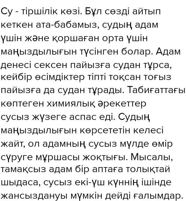 Су тіршілік көзі болсада оны біз ластамай,судың бетіне қоқыс тастамай баптау кажет.