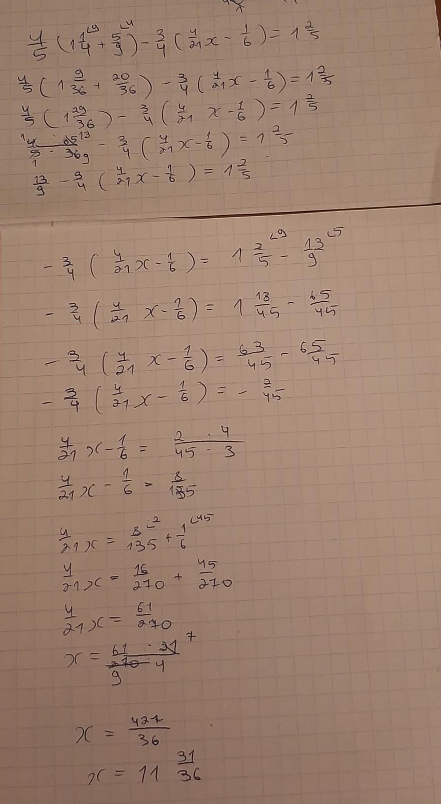 г. 4/5 (1 1/4x + 5/9) − 3/4 (4/21x − 1/6) = 1 2/5