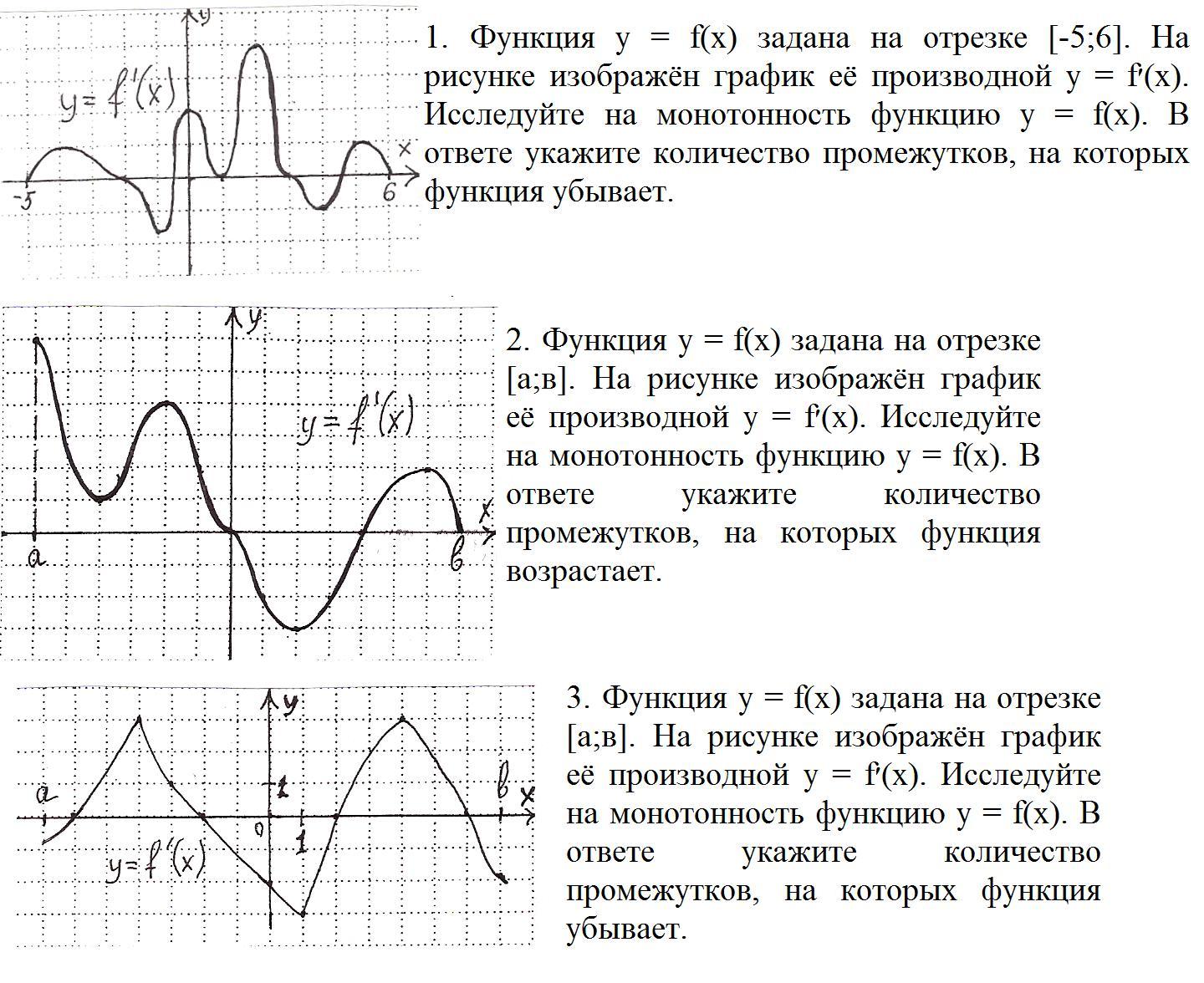 функция возрастает там, где производная больше нуля или равна нулю, если имеет нестрогую монотонность. и убывает соответственно, где меньше нуля ее производная или равна нулю.