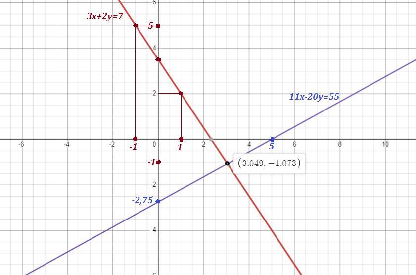 График функции 11х-20у=55 проходит через точки (0;-2,75) , (5;0) .