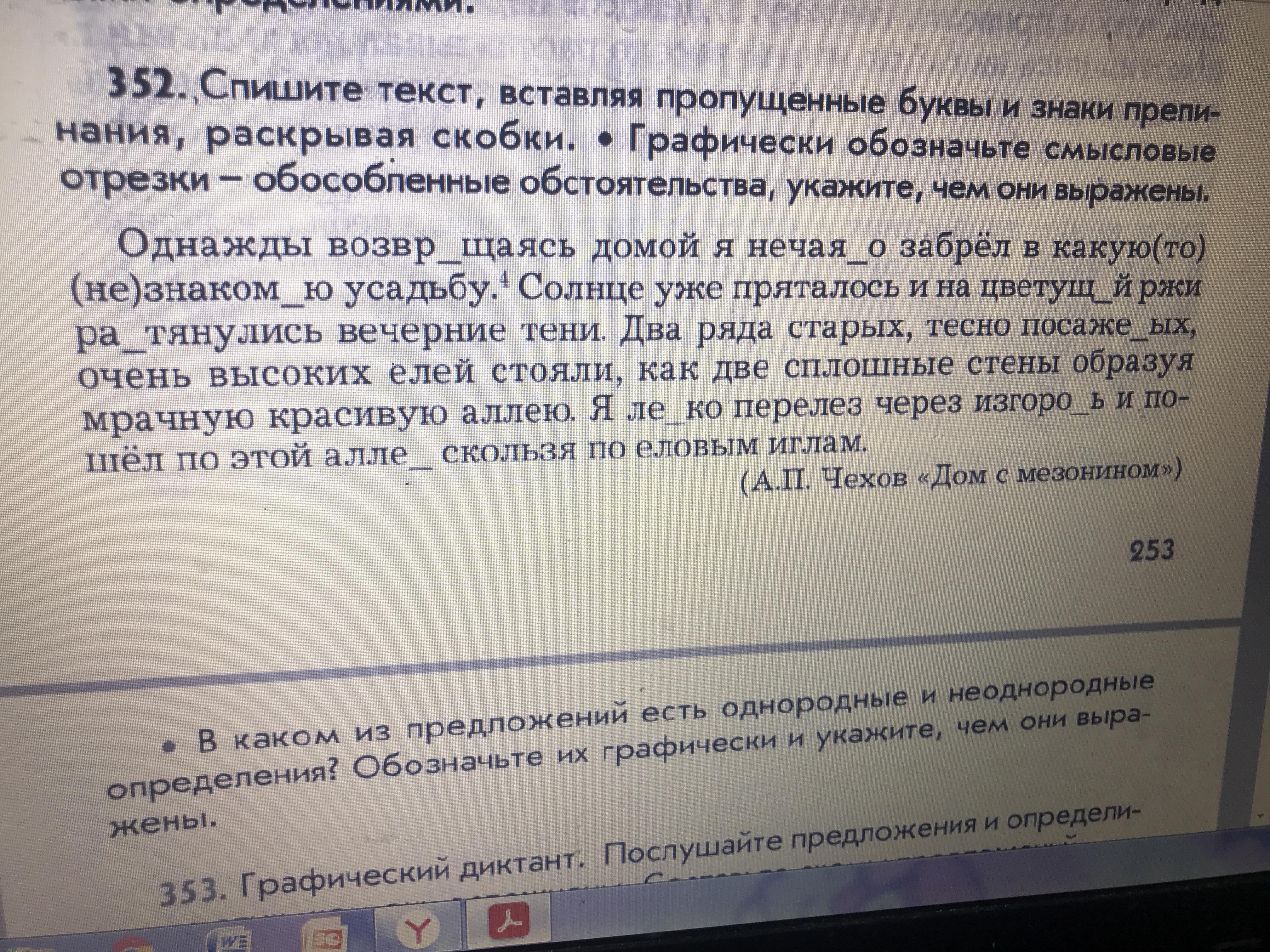 Однажды, /возвращаясь домой/_._._ (ДО), я я нечаянно забрёл в какую-то незнакомую усадьбу. С солнце уже пряталось, и на цветущей ржи растянулись вечерние тени. Два ряда старых~~~, тесно посаженных~~~ елей стояли, /как две сплошные стены/_._._ (сравн.оборот), /образуя мрачную~~~ красивую~~~ аллею/_._._ (ДО). Я легко перелез через изгородь и пошёл по этой аллее, /скользя по еловым иглам/_._._ (ДО).