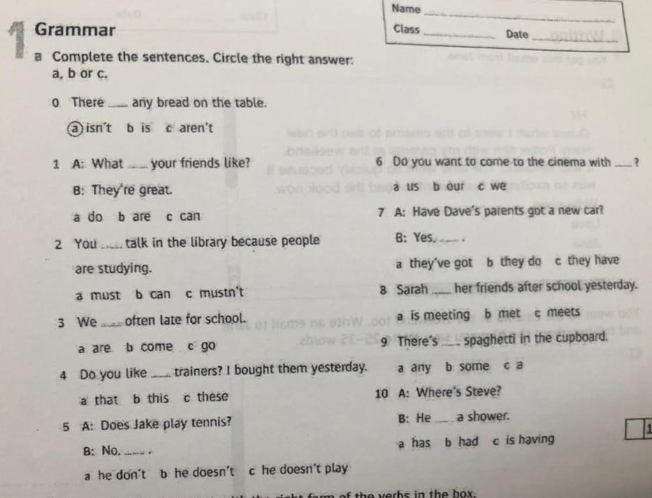 Grammar a Complete the sentences. Circle the right answer: a, b or c. 0. There any bread on the table. a) isn't b is ▸ aren't 1 A: What your friends like? B: They're great. à do b are c can 2 You talk in the library because people are studying. a must b can c mustn't 3 We often late for school. a are b come c go 4 Do you like trainers? I bought them yesterday. a that b this c these 10 5 A: Does Jake play tennis? B: No... a he don't b he doesn't c he doesn't play Class Date 6 Do you want to come to the cinema with à us b our c we 7 A: Have Dave's parents got a new car? B: Yes... a they've got b they do c they have 8 Sarah her friends after school yesterday. 07 lisme ns 63nWooa is meeting b met è meets abrow 2E-259) There's spaghetti in the cupboard. a any b some ca A: Where's Steve? B: He a shower. a has b had c is having the verbs in the box. 1 ПОМОГИТЕ ПОЖАЛУЙСТА, ЗАВТРА ТЕСТ ПО АНГЛИЙСКОМУ