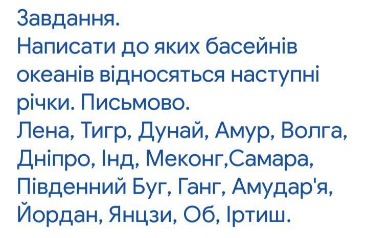 Завдання. Написати до яких басейнів океанів відносяться наступні річки. Письмово. Лена, Тигр, Дунай, Амур, Волга, Дніпро, Інд, Меконг,Самара, Південний Буг, Ганг, Амудар'я, Йордан, Янцзи, Об, Іртиш.