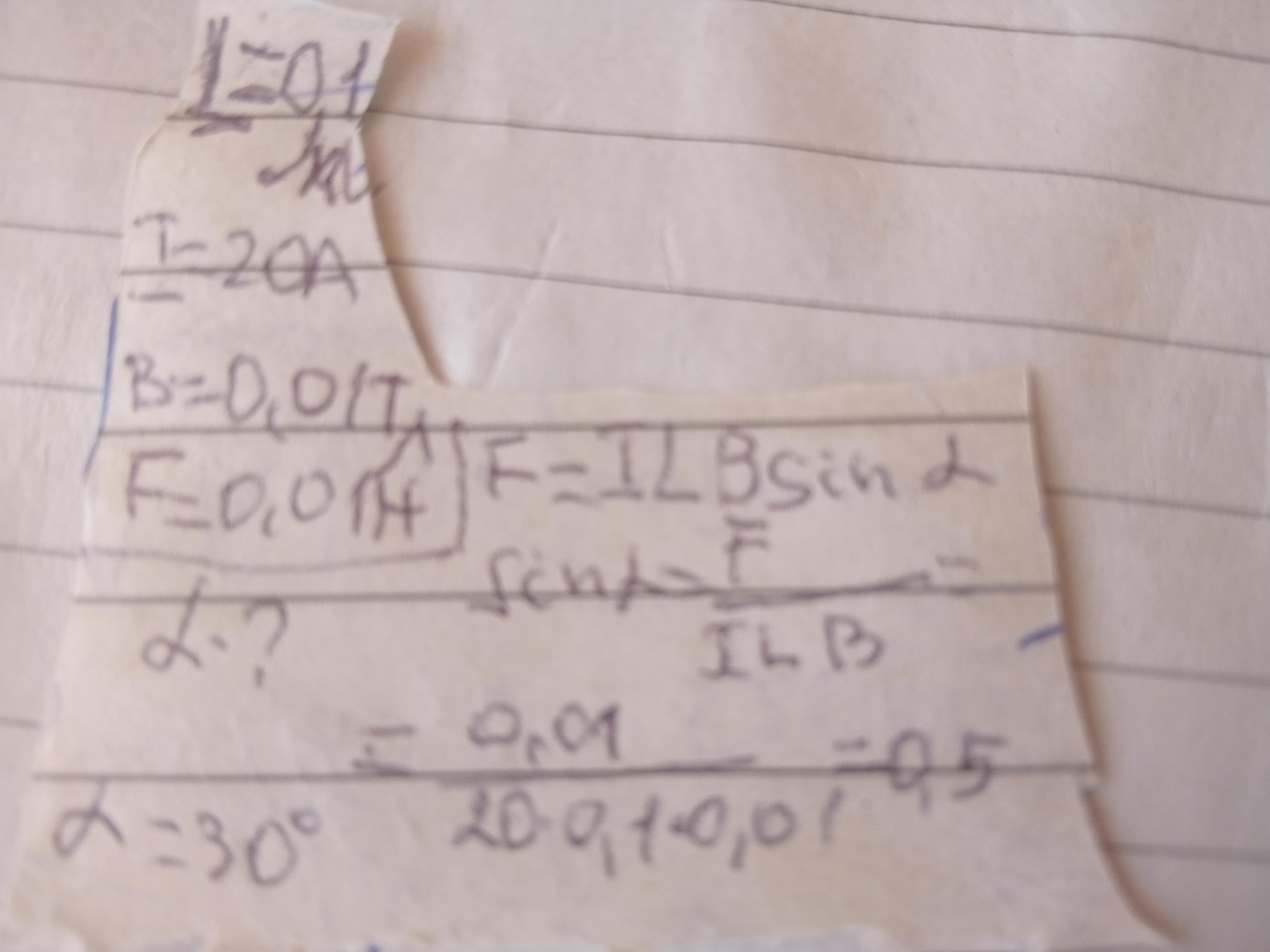 3. Прямой провод длиной 10 см, по которому течет ток с силой 20 А, находиться в однородном магнитном поле с индукцией 0,01 Тл. Найти угол между направлениями вектора индукции и тока, если на провод действует сила 0,01 Н.
