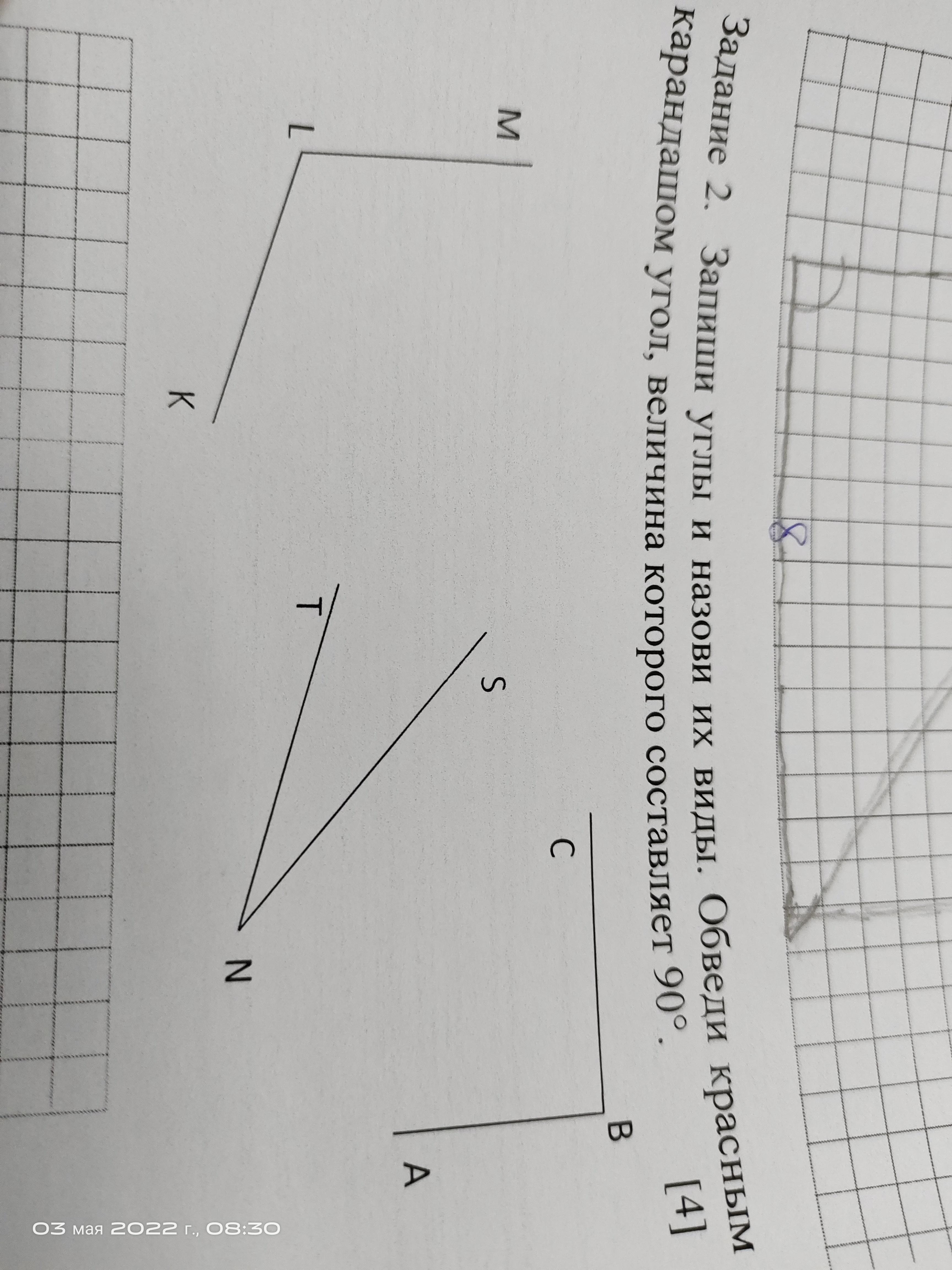 Запиши углы и назови их виды. Обвели красным карандашом угол, величина которого составляет 90 градусов
