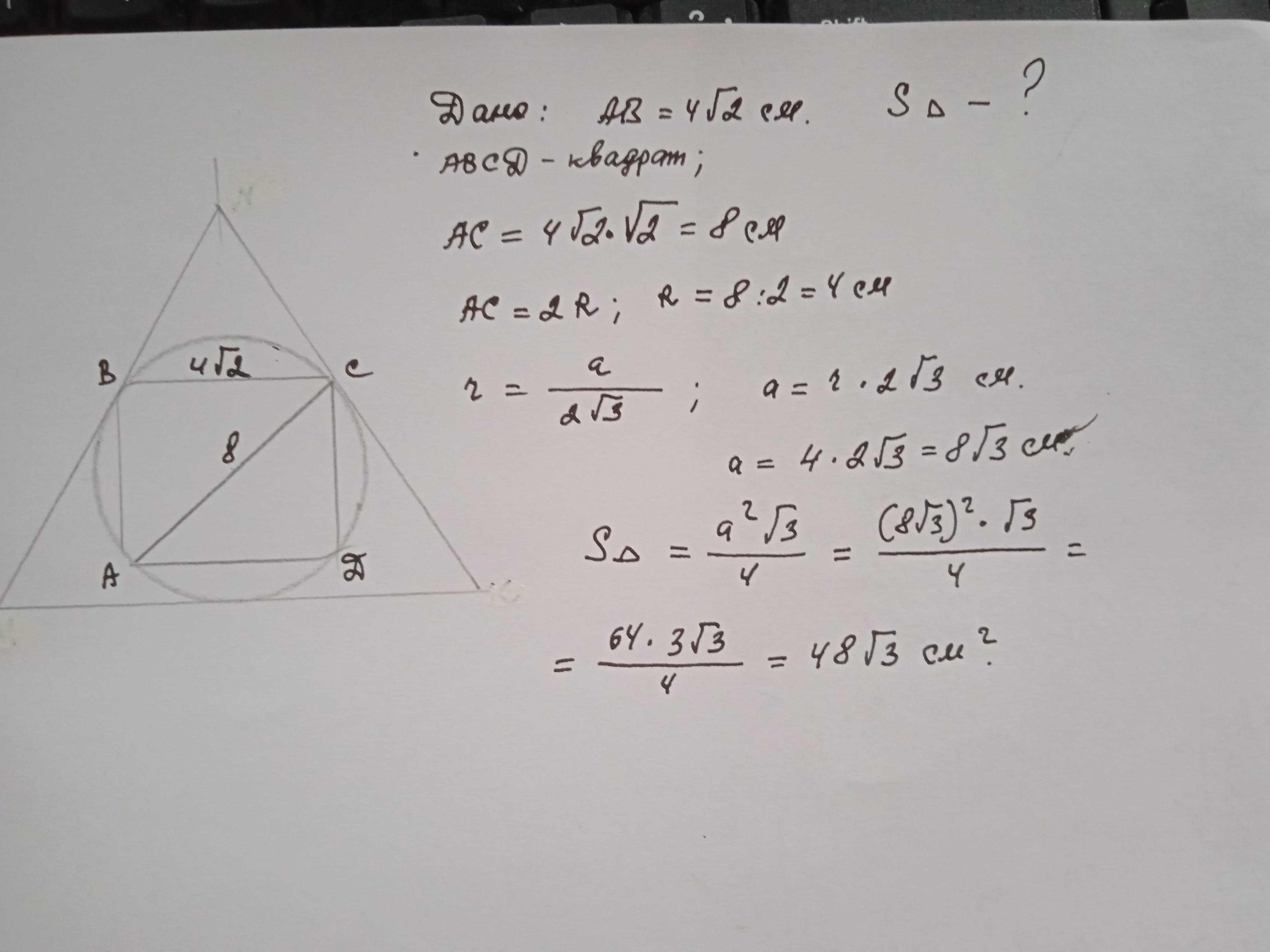 4. В окружность вписан квадрат со стороной 4√2 см. Найдите площадь правильного треугольника, описанного около этой окружности. скореййййй 5 сделано