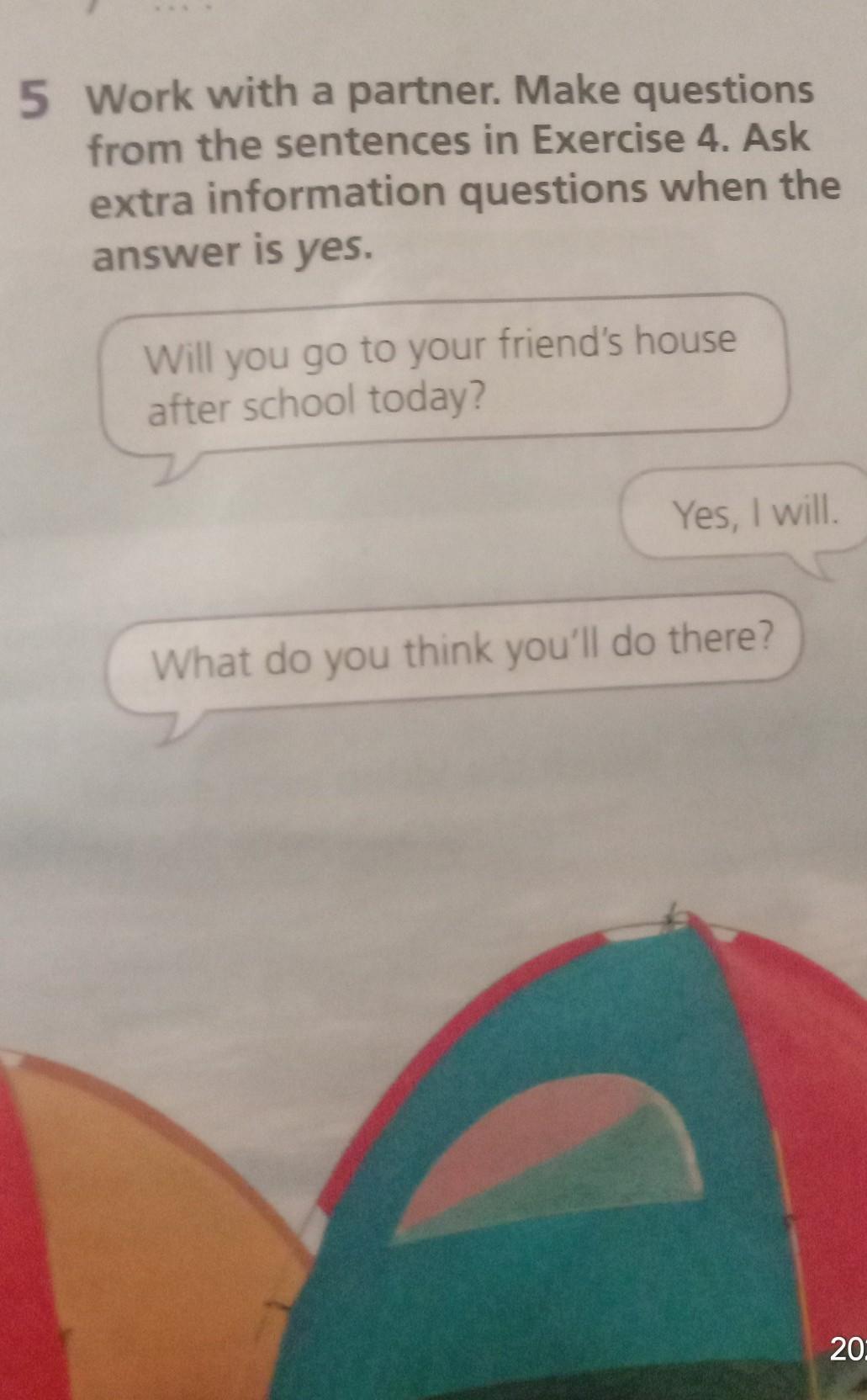 5 Work with a partner. Make questions from the sentences in Exercise 4. Ask extra information questions when the answer is yes. Will you go to your friend's house after school today? Yes, I will.