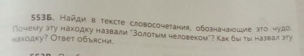 553Б. Найди в тексте словосочетания, обозначающие это чудо. Почему эту находку назвали "Золотым человеком"? Как бы ты назвал эту находку? Ответ объясни.
