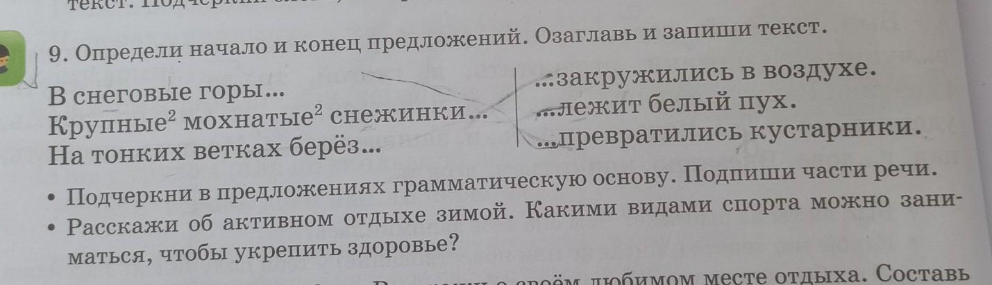 9. Определи начало и конец предложений. Озаглавь и запиши текст В снеговые горы... ...закружились в воздухе. Крупные? мохнатые2 снежинки... ...лежит белый пух. На тонких ветках берёз... „превратились кустарники. Подчеркни в предложениях грамматическую основу. Подпиши части речи. • Расскажи об активном отдыхе зимой. Какими видами спорта можно зани- маться, чтобы укрепить здоровье? о 10. Рассмотри фотографии. Расскажи о своём любимом месте отдыха