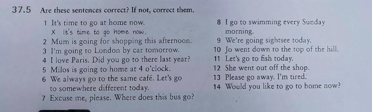 37.5 are these sentences correct? if not, correct them. 1 it's time to go at home now. 8 i go to swimming every sunday x it's time to go home now. 2 mum is going for shopping this afternoon. 3 i'm going to london by car tomorrow. 4 i love paris. did you go there last year? 5 milos is going to home at 4 o'clock. 6 we always go to the same café. let's go to somewhere different today. 7 excuse me, please. where does this bus go? morning. 9 we're going sightsee today. 10 jo went down to the top of the hill. 11 let's go to fish today. 12 she went out off the shop. 13 please go away. i'm tired. 14 would you like to go to home now?