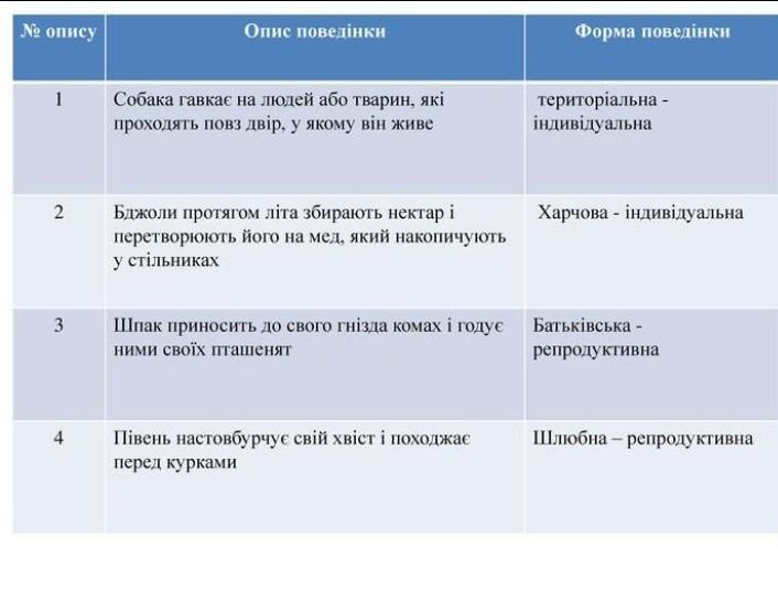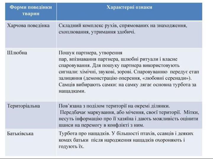 - Складність поведінки тварин залежить від рівня розвитку їхньої нервової системи. Отже, поведінка тварин є основою їх пристосованості до середовища і являє собою різноманітні активні дії, що є реакціями на впливи середовища