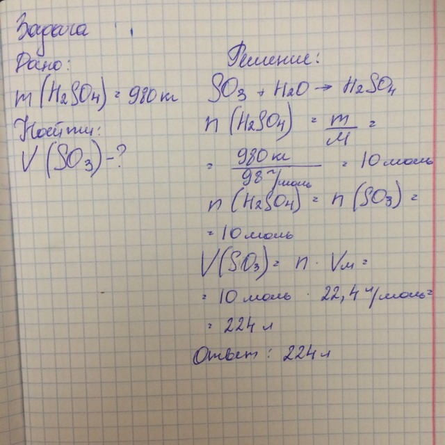 Какой объем ( при н.у. ) оксида серы ( VI) потребуется для получения серной кислоты массой 980 кг?